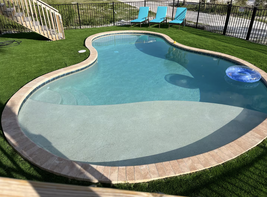 Amenities: Fenced pool area with loungers, full kitchen, covered parking